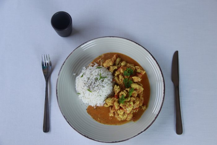 Pollo al curry en leche de coco y arroz con amapolas