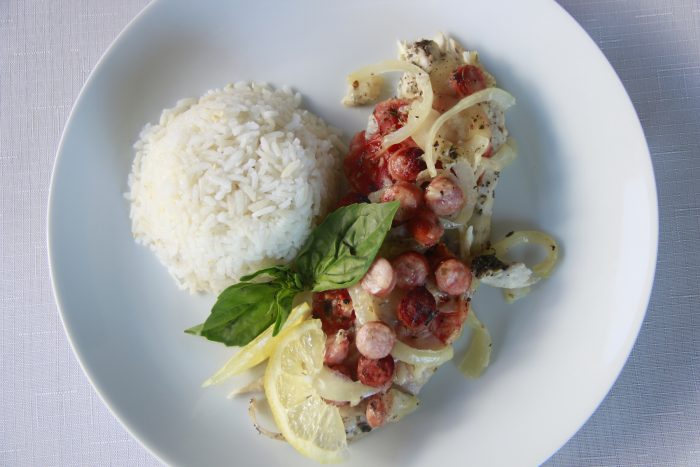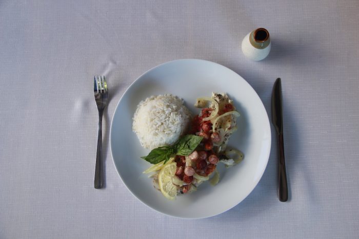 Reineta, salsa de soya, cebollín, jengibre y ajo. Mix de verduritas con champiñones, esparragos y pimentón rojo.